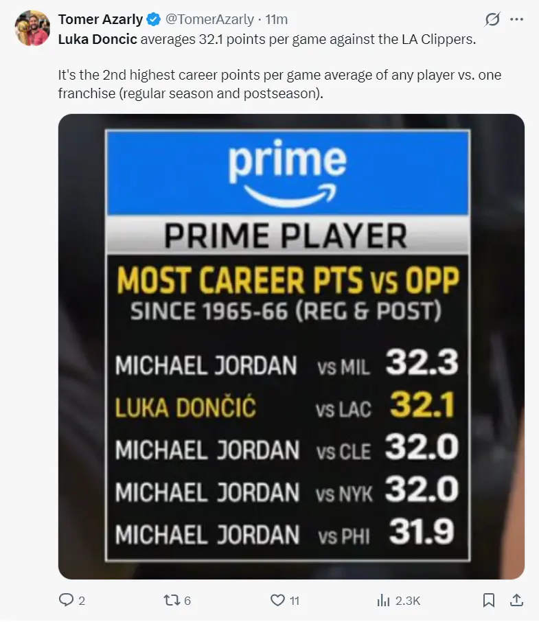 赛前快船记者晒出对阵LAC场均得分最高排行榜,乔丹场均32.3分第一,东契奇场均32.1分第二,所以东契奇打快船是有心得的,快船记者希望能限制住他。