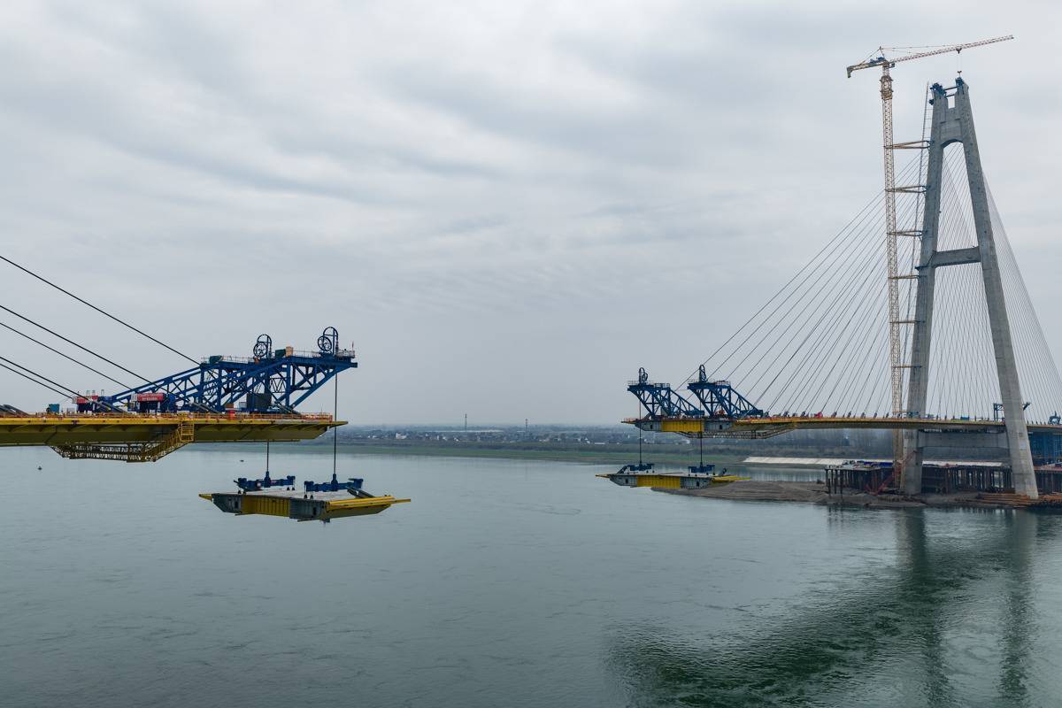 枝江长江大桥全长1549米,主跨890米,连接枝江市区与百里洲镇,是目前在建的世界跨径最大的钢—UHPC组合梁斜拉桥。