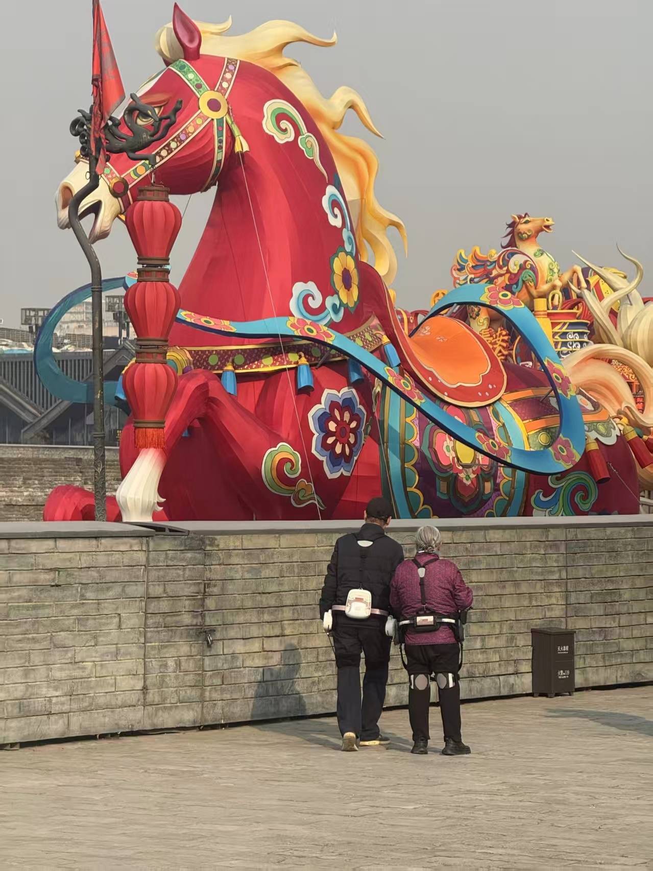 在这幅流动的画卷中,两位老人身上的醒目装置令人眼前一亮——就像穿着科幻片里的“机甲”。两人的步伐稳健有力,似乎这套装备正牵拉着他们行走。
