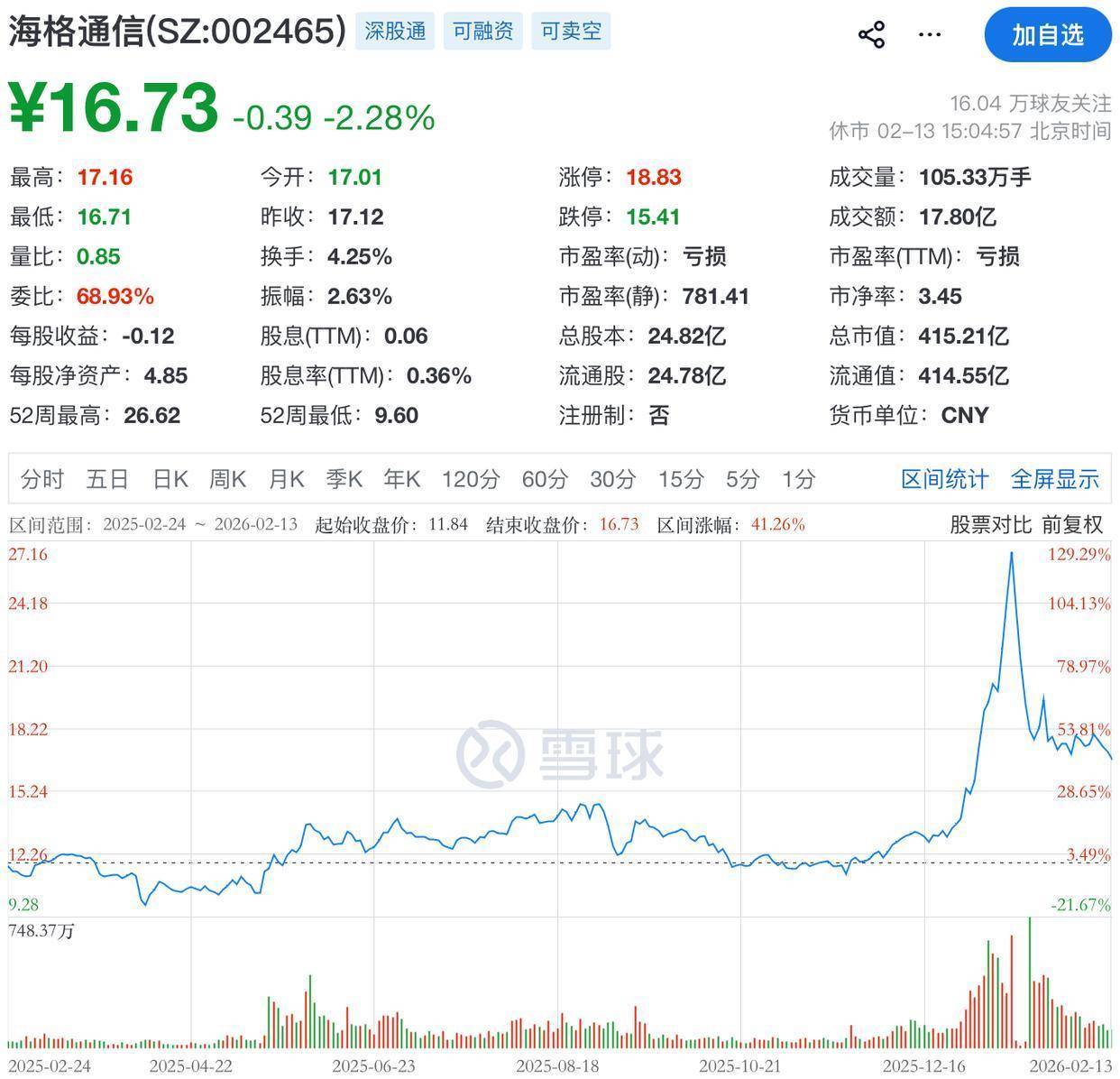二级市场上,截至2月13日收盘,海格通信下跌2.28%报16.73元/股,总市值为415.21亿元。
