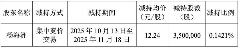 公告显示,持有公司股份24,425,125股(约占剔除回购专用账户股份后公司总股本的0.9920%)的股东杨海洲计划在本公告披露之日起15个交易日后的3个月内以集中竞价交易方式减持本公司股份不超过4,000,000股(约占剔除回购专用账户股份后公司总股本的0.1624%)。