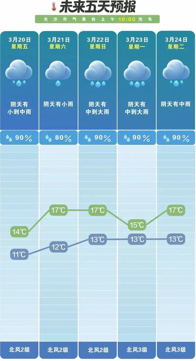 今日,长沙市气象台发布未来五天天气预报,数据显示,从20日到24日,长沙几乎天天有雨。具体来看:20日阴天有小到中雨,降水概率90%,气温11℃至14℃;21日阴天有小雨,降水概率80%配资讨论网,气温略有上升配资讨论网,12℃至17℃; 22日阴天有中到大雨,降水概率90%,北风2级,气温13℃至17℃;23日阴天有中到大雨,降水概率90%,北风3级,气温略降,13℃至15℃;24日阴天有中雨,降水概率90%,北风3级,气温13℃至17℃。