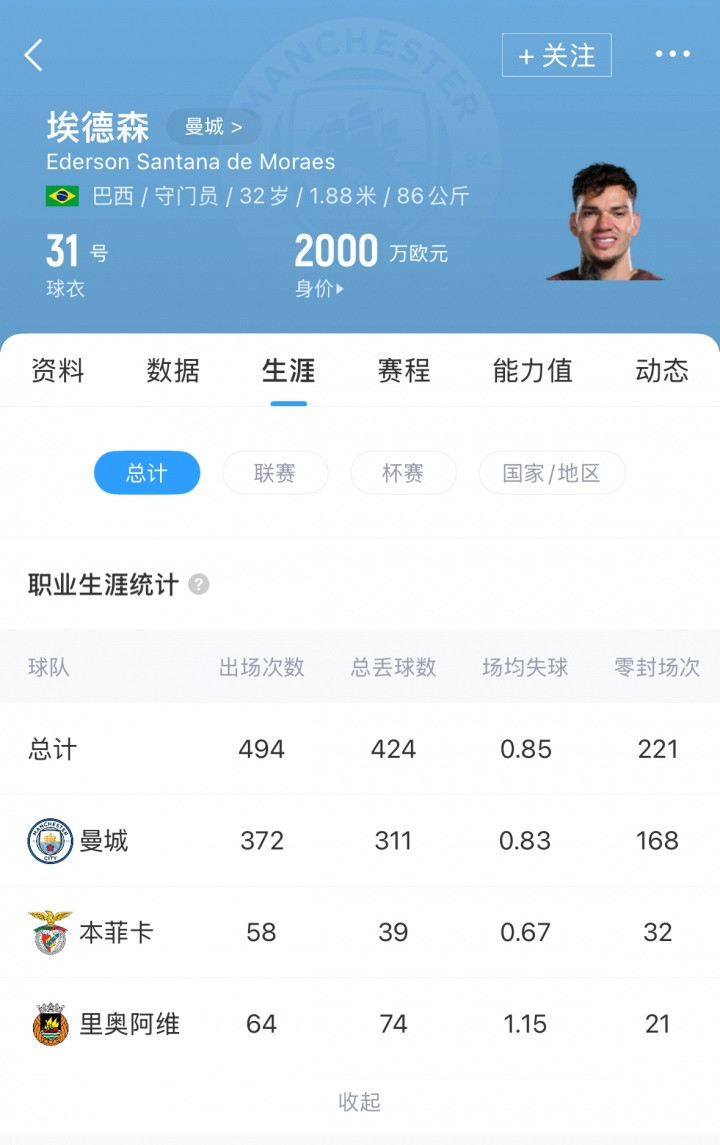 埃德森现年31岁,他与曼城的合同将在明年到期,现身价2000万欧。2017年夏窗埃德森加盟曼城效力至今,上赛季在英超出场26次,一共帮助曼城获得过6次英超冠军,1次欧冠冠军、1次世俱杯冠军、4次联赛杯冠军和2次足总杯冠军。